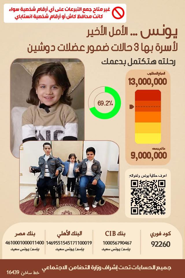 يونس سعيد مريض ضمور العضلات فاضل ايام بسيطه ويفقد الأمل في علاجه بفضل الله ثم مشاركة الطيبين وصلنا 9 مليون جنيه ومتبقي 4 مليون ويونس ياخد علاجه ويرج...